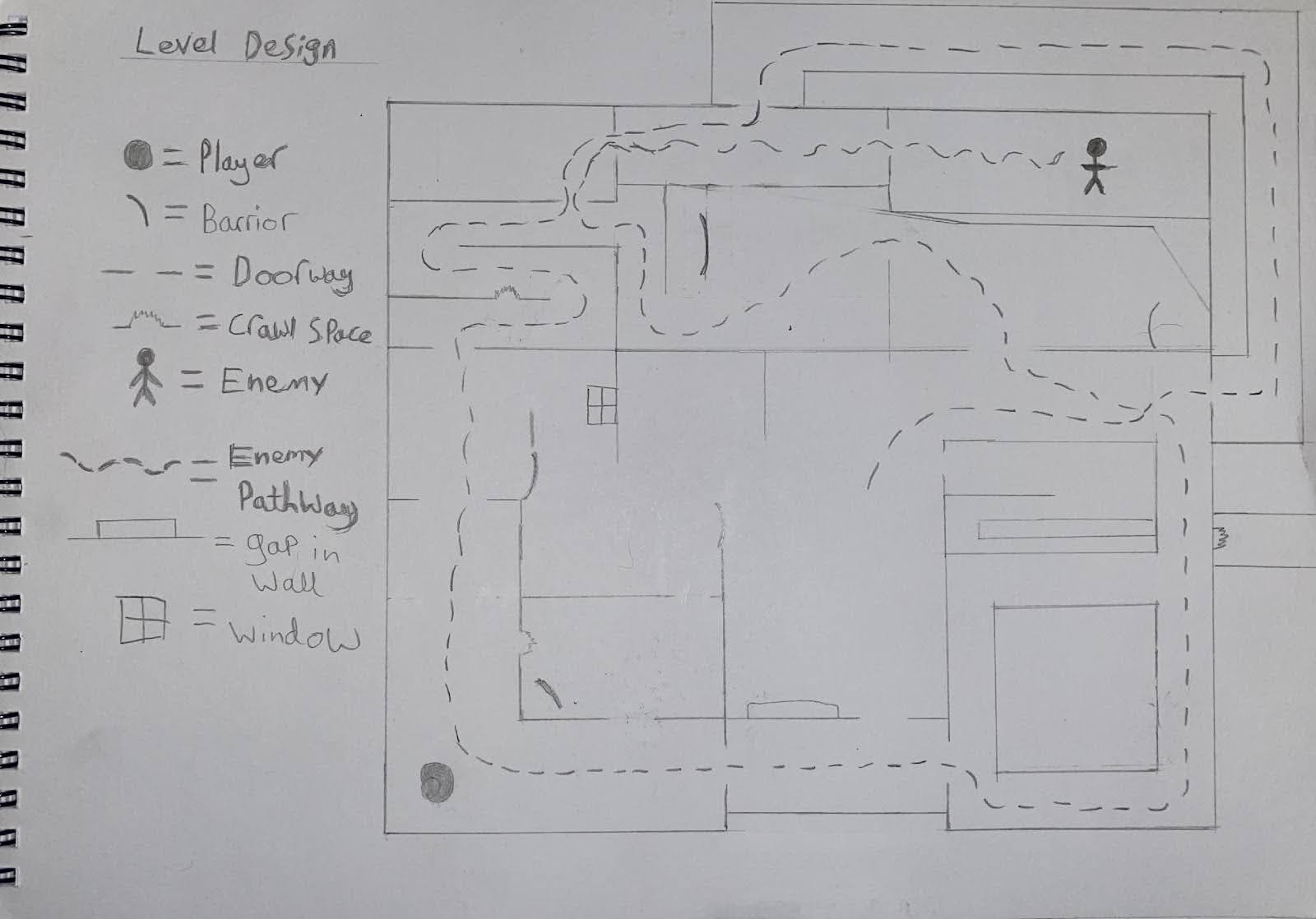 My goal for this project was to create and bring alive a simple concept. In this instance, the concept I came up with is a strategy survival game. Being placed into a creepy environment where a monster lies, you as the player need to manoeuvre though the tight hallways and open spaces. There are a few crawl spaces in which you can hide in.